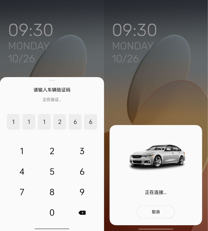 3、手机端弹出车辆连接面板,点击连接并输入配对码(仅首次需要输入配对码);