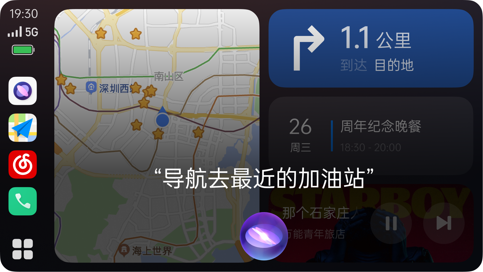连接车机后,可通过小布助手语音控制车机内容,如“导航去最近的加油站”、“导航去最近的大型商场”等。